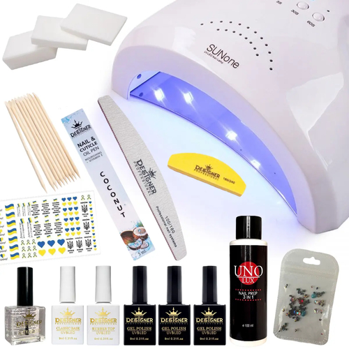 Базове покриття(1шт) гарантує вдале нанесення гель-лаку і дозволяє зберегти практично первозданний вид манікюру тривалий час. Designer Professional Classic Base не дає відшарування навіть на м'яких і тонких нігтях, завдяки своїй консистенції і еластичності підходить для педикюру. Топове покриття(1шт) - завершальний етап будь-якого манікюру гель-лаком. Rubber Top закріпить колір гель-лака, збереже його блиск, міцність, а також захистить від негативної дії зовнішніх чинників : вигорання, подряпин або сколов.